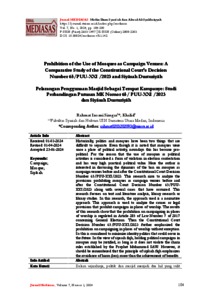 Dalam sejarahnya, politik dan masjid menjadi dua hal yang sulit dipisahkan. Meski tencatat bahwa masjid pernah menjadi tempat kegiatan politik namun dimasa sekarang hal tersebut menjadi prokotra. Dengan alasan bahwa penggunaan masjid sebagai kegiatan politik dianggap sebagai bentuk pelanggaran dalam kontestasi pemilu dan memiliki nilai politik praktis yang sangat tinggi. Disini penulis tertarik mendiskusikan tentang dinamika larangan masjid sebagai tempat kampanye sebelum dan sesudah adanya Putusan MK Nomor 65/PUU-XXI/2023. Penelitian ini bertujuan menganalisa tentang ketentuan larangan masjid sebagai tempat kampanye sebelum dan sesudah adanya Putusan MK Nomor 65/PUUXXI/2023 disertai bebera kasus yang perneh terjadi. Penelitian ini berfokus pada analisis teks dan literatur library research atau studi kepustakaan. Dalam penelitian ini, pendekatan yang digunakan adalah pendekatan normatif. Metode pendekatan ini digunakan untuk menganalisis sebab atau ketentua hukum yang melarang kampanye di tempat ibadah. Hasil penelitian ini menunjukan bahwa larangan kampanye di tempat ibadah diatur pada pasal 285 UndangUndang Nomor 7 Tahun 2017 tentang Pemilihan Umum. Kemdian Putusan Mahkamah Konstitusi Nomor 65/PUU-XXI/2023 semakin menegaskan larangan tentang larangan kampanye di tempat ibadah tanpa pengecualian. Sehingga hal ini dianggap dapat meminimalisir politik indentitas yang dapat terjadi di kemudian hari. Dalam pandangan fiqih siyāsah, melakukan kampanye politik di masjid mungkin dapat dibenarkan, selama tidak melanggar aturan syariat yang telah ditetapkan oleh Nabi Muhammad SAW. Namun, perlu diingat bahwa prinsip fiqih siyāsah menekankan pada penghindaran mudharat (kerugian) lebih daripada pencapaian manfaat.