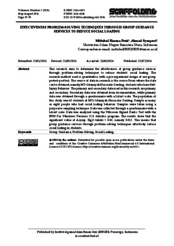 Putri, Miftahul Hasana (2024) Effectiveness Problem-Solving Techniques Through Group Guidance Services to Reduce Social Loafing. Scaffolding: Jurnal Pendidikan Islam dan Multikulturalisme, 6 (2).