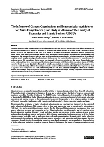 Ilman Ritonga, Afdolli The Influence of Campus Organisations and Extracurricular Activities on Soft Skills Competencies (Case Study of Alumni of The Faculty of Economics and Islamic Business UINSU). Quantitative Economics and Management Studies (QEMS).