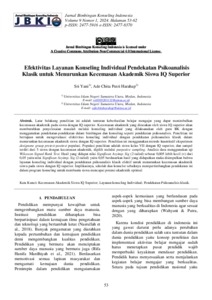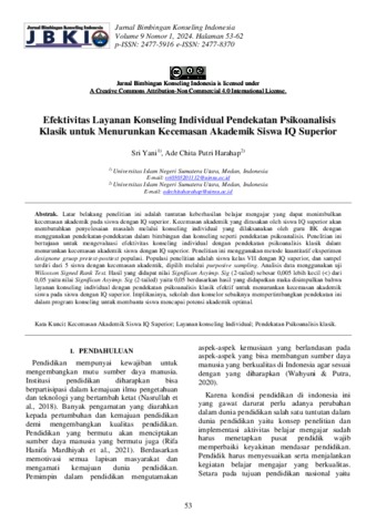 Latar belakang penelitian ini adalah tuntutan keberhasilan belajar mengajar yang dapat menimbulkan kecemasan akademik pada siswa dengan IQ superior. Kecemasan akademik yang dirasakan oleh siswa IQ superior akan membutuhkan penyelesaian masalah melalui konseling individual yang dilaksanakan oleh guru BK dengan menggunakan pendekatan-pendekatan dalam bimbingan dan konseling seperti pendekatan psikoanalisis. Penelitian ini bertujuan untuk mengevaluasi efektivitas konseling individual dengan pendekatan psikoanalisis klasik dalam menurunkan kecemasan akademik siswa dengan IQ superior. Penelitian ini menggunakan metode kuantitatif eksperimen designone gruop pretest-posttest populasi. Populasi penelitian adalah siswa kelas VII dengan IQ superior, dan sampel terdiri dari 5 siswa dengan kecemasan akademik, dipilih melalui purposive sampling. Analisis data menggunakan uji Wilcoxon Signed Rank Test. Hasil yang didapat nilai Significan Asyimp. Sig (2-tailed) sebesar 0,005 lebih kecil (<) dari 0,05 yaitu nilai Significan Asyimp. Sig (2-tailed) yaitu 0,05 berdasarkan hasil yang didapatkan maka disimpulkan bahwa layanan konseling individual dengan pendekatan psikoanalisis klasik efektif untuk menurunkan kecemasan akademik siswa pada siswa dengan IQ superior. Implikasinya, sekolah dan konselor sebaiknya mempertimbangkan pendekatan ini dalam program konseling untuk membantu siswa mencapai potensi akademik optimal.
