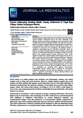 Nurhayati, Talitha Syafira (2024) Factors Influencing Smoking Habits Among Adolescents in Tegal Rejo Village, Medan Perjuangan District. Journal La Medihealtico, 5 (3).