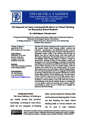 Rahman, M. Arif (2024) Development of Comic Learning Media Based on Critical Thinking for Elementary School Students. Didaktika Tauhidi Jurnal Pendidikan Guru Sekolah Dasar.