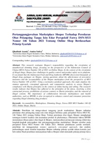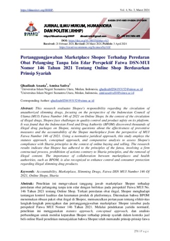 Anasta, Qhadizah Pertanggungjawaban Marketplace Shopee Terhadap Peredaran Obat Pelangsing Tanpa Izin Edar Perspektif Fatwa DSN-MUI Nomor 146 Tahun 2021 Tentang Online Shop Berdasarkan Prinsip Syariah. (JIHHP) Jurnal Ilmu Hukum, Humaniora dan Politik.