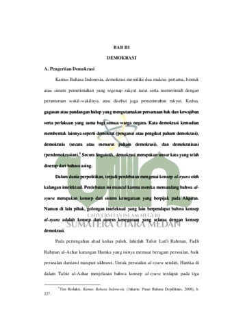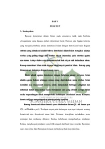 Demokrasi dalam konteks negara modern adalah sistem di mana warganya bebas mengambil keputusan berdasarkan kekuasaan mayoritas. Islam juga mempunyai nilai-nilai yang lebih tinggi tentang demokrasi. Ayat-ayat Alquran yang secara konten menyebutkan prinsip demokrasi yaitu konsep syura. Namun, apakah konsep demokrasi tersebut dalam Alquran ada persamaan dan relevansinya dengan konsep demokrasi modern? Inilah yang menjadi tolak ukur kajian skripsi ini. Penelitian ini menggunakan pendekatan kualitatif dengan jenis studi pustaka (library research). Data yang terkumpul kemudian dianalisis menggunakan metode mawdu’i (tematik). Tujuan penelitian ini adalah untuk mengungkap makna dan konsep demokrasi dalam Alquran serta untuk implementasi dalam kehidupan berbangsa dan bernegara. Hasil analisis menunjukkan bahwa demokrasi yang disebutkan dalam Alquran identik dengan konsep syura. Konsep syura merupakan keharusan untuk melakukan musyawarah di dalam urusan-urusan duniawi, baik urusan keluarga, muamalah, maupun urusan bidang politik. Konsep demokrasi dalam bentuk syura disebutkan dalam QS. Ali Imran ayat 159, Al-Maidah ayat 8. Terdapat tiga poin hubungan ayat-ayat Alquran tentang demokrasi dan demokrasi masa kini. Pertama, kewajiban melakukan temu pendapat dan melarang diktator. Kedua, kebebasan mengeluarkan pendapat. Ketiga, menghargai pendapat yang lebih unggul dari hasil musyawarah. Keempat, suara mayoritas diperhitungkan dengan melindungi hak-hak minoritas.
