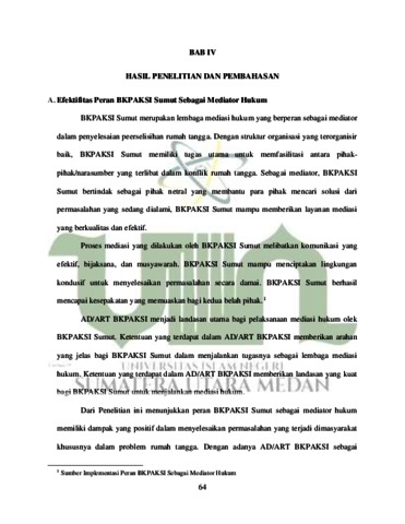 Penelitian ini berjudul Efektivitas Peran BKPAKSI Sebagai Mediator Hukum Dalam Problem Rumah Tangga (Studi di BKPAKSI Sumut). Persoalan mediasi diatur dalam peraturan perundang-undangan di Indonesia. Diantara peraturan itu UndangUndang Nomor 30 Tahun 1999 tentang landasan yuridis bagi penyelenggaraan mediasi di luar pengadilan, serta PERMA Nomor 1 Tahun 2016 tentang prosedur mediasi di pengadilan, dan PP Nomor 54 Tahun 2008 tentang lembaga penyedia jasa pelayanan penyelesaian sengketa lingkungan hidup di luar pengadilan. Penelitian ini bertujuan yaitu: 1) Untuk mengetahui efektivitas peran BKPAKSI Sumut sebagai mediator hukum dalam problem rumah tangga. 2) Untuk mengetahui Kendala dan Pendukung Pelaksanaan tugas-tugas BKPAKSI di Sumut dalam sebagai mediator hukum. 3) Untuk mengetahui strategi BKPAKSI Sumut dalam perwujudan keluarga sakinah. Jenis penelitian ini ialah penelitian empiris, data penelitian ini diperoleh melalui observasi, wawancara dan dokumentasi. Hasil penelitian ini menunjukkan bahwa mengacu pada peran BKPAKSI Sumut dengan tujuan untuk memberikan rasa keadilan kepada para pihak sebagai mediator atau penengah dengan problem dalam rumah tangga. 1) Di Indonesia sendiri fungsi lembaga bantuan hukum salah satunya bertujuan untuk mewujudkan suatu lembaga peradilan yang hebat. Dengan adanya lembaga bantuan hukum ini diharapkan masyarakat tidak kesulitan dalam mencari keadilan. Salah satu penyelesaian sengketa di luar pengadilan adalah melalui mediasi. Seperti kasus yang terjadi di Kecamatan Medan Tembung, pernikahan sudah 27 tahun sedang terjadinya masalah karena faktor ekonomi, pihak BKPAKSI langsung menangani dan memberi nasihat kepada narasumber, dan akhirnya mereka tidak jadi bercerai. 2) Berbagai faktor faktor penghambatnya adalah para mediator sedikit kesulitan ketika menangani narasumber yang sudah mempunyai masalah yang komplek. Sehingga para mediator harus mempunyai cara-cara yang sedemikian rupa untuk bisa menghadapi narasumber yang berbeda karakter. 3) Strategi BKPAKSI Sumut dalam perwujudan keluarga sakinah adalah memberi penasihatan atau konsultasi sesuai dengan tingkat permasalahan rumah tangga yang terjadi agar kembali sakinah mawaddah dan diusahakan warahmahnya turun.