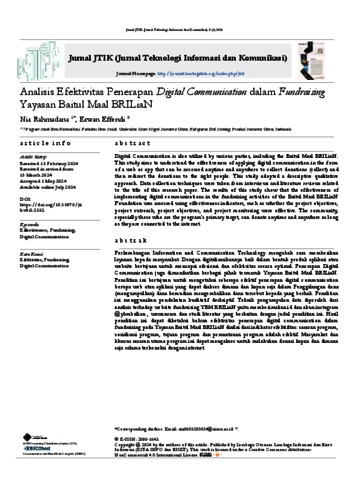 Rahmadana, Nia (2024) Analisis Efektivitas Penerapan Digital Communication dalam Fundraising Yayasan Baitul Maal BRILiaN. Jurnal JTIK (Jurnal Teknologi Informasi dan Komunikasi), 8 (3).