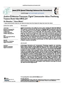Perkembangan Information and Communication Technology mengubah cara memberikan layanan kepada masyarakat. Dengan digitalisasikannya baik dalam bentuk produk aplikasi atau website bertujuan untuk mencapai efesiensi dan efektivitas secara optimal. Penerapan Digital Communication juga dimanfaatkan berbagai pihak termasuk Yayasan Baitul Maal BRILiaN. Penelitian ini bertujuan untuk mengetahui seberapa efektif penerapan digital communication berupa web atau aplikasi yang dapat diakses dimana dan kapan saja dalam Penggalangan dana (mengumpulkan) dana kemudian mengembalikan dana tersebut kepada yang berhak. Penelitian ini menggunakan pendekatan kualitatif deskriptif. Teknik pengumpulan data diperoleh dari analisis terhadap website fundraising YBM BRILiaN yaitu memberimakna.id dan akun instagram @ybmbrilian , wawancara dan studi literatur yang berkaitan dengan judul penelitian ini. Hasil penelitian ini dapat diketahui bahwa efektivitas penerapan digital communication dalam fundraising pada Yayasan Baitul Maal BRILiaN dinilai dari indikator efektifitas: sasaran program, sosialisasi program, tujuan program dan pemantauan program adalah efektif. Masyarakat dan khusus sasaran utama program ini dapat mengakses untuk melakukan donasi kapan dan dimana saja selama terkoneksi dengan internet.