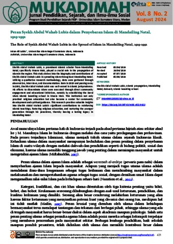 Lubis, Intan Ali (2024) Peran Syekh Abdul Wahab Lubis dalam Penyebaran Islam di Mandailing Natal, 1919-1991. Mukadimah: Jurnal Pendidikan, Sejarah, dan Ilmu-Ilmu Sosial.