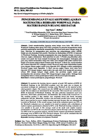 Yusra, Isna (2024) Pengembangan Evaluasi Pembelajaran Matematika Berbasis Wordwall Pada Materi Bangun Ruang Sisi Datar. JP2M (Jurnal Pendidikan dan Pembelajaran Matematika), 10 (1).