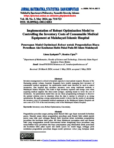 Syahputri, Linna (2024) Implementation of Robust Optimization Model to Controlling the Inventory Costs of Consumable Medical Equipment at Malahayati Islamic Hospital. Jurnal Matematika, Statistika Dan Komputasi.