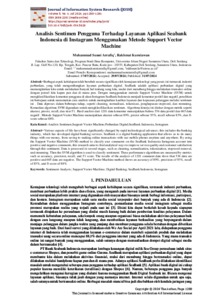 Berbagai aspek kehidupan telah berubah secara signifikan oleh kemajuan teknologi yang pesat; ini termasuk industri perbankan, yang telah mengembangkan layanan perbankan digital. SeaBank adalah aplikasi perbankan digital yang memungkinkan kita untuk melakukan banyak hal tentang uang kita, mulai dari menabung hingga melakukan transaksi online dengan ponsel kita kapan pun dan di mana pun. Dengan menggunakan metode Support Vector Machine (SVM) untuk mengklasifikasikan komentar pengguna di akun Instagram SeaBank Indonesia menjadi komentar positif dan negatif, penelitian ini bertujuan untuk menemukan cara analisis untuk meningkatkan kualitas layanan dan kepuasan pelanggan melalui sentimen ini . Data diproses dalam beberapa tahap, seperti cleaning, normalisasi, tokenisasi, penghapusan stopword, dan stemming. Kemudian algoritma SVM digunakan untuk mengklasifikasikan sentimen. Algoritma kinerja ini diukur dengan metrik seperti akurasi, presisi, recall, dan skor F1. Hasil analisis dari 1201 data komentar menunjukkan bahwa 536 data positif dan 665 data negatif . Metode Support Vector Machine menunjukkan akurasi sebesar 89%, presisi sebesar 93%, recall sebesar 83%, dan flscore sebesar 88%.