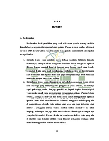 Penelitian ini dilakukan di SMK Swasta Gelora Jaya Nusantara. Penelitian ini bertujuan untuk mengevaluasi berbagai hambatan yang dihadapi oleh siswa SMK Gelora Jaya Nusantara dalam memanfaatkan aplikasi iPusnas sebagai sumber informasi. Aplikasi iPusnas merupakan perpustakaan digital yang menyediakan berbagai buku dan sumber daya lainnya untuk mendukung proses belajar siswa. Namun, dalam praktiknya, siswa sering kali mengalami berbagai hambatan dalam penggunaan aplikasi tersebut. Penelitian ini menggunakan metode kualitatif dengan pendekatan deskriptif, di mana data dikumpulkan melalui wawancara mendalam dan observasi langsung terhadap siswa yang menggunakan iPusnas. Analisis data dilakukan dengan mengaitkan temuan lapangan dengan teori-teori yang relevan. Hasil penelitian menunjukkan bahwa kendala teknis yang paling sering dihadapi oleh siswa meliputi masalah koneksi internet yang tidak stabil, bug dan error pada aplikasi, keterbatasan perangkat digital yang digunakan, serta keterbatasan fitur aplikasi iPusnas itu sendiri. Selain itu, kendala non-teknis yang ditemukan mencakup rendahnya literasi digital di kalangan siswa, kurangnya motivasi dan minat untuk menggunakan aplikasi, serta keterbatasan koleksi buku yang tersedia di iPusnas. Penelitian ini menyarankan perbaikan pada infrastruktur teknologi yang mendukung penggunaan iPusnas, peningkatan literasi digital di kalangan siswa, serta pengembangan fitur aplikasi yang lebih komprehensif dan user-friendly. Diharapkan hasil penelitian ini dapat menjadi acuan bagi pengembang aplikasi iPusnas dan pihak sekolah dalam meningkatkan efektivitas penggunaan perpustakaan digital sebagai sumber informasi pendidikan.