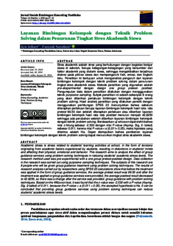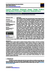 Stres akademik adalah stres yang berhubungan dengan kegiatan belajar siswa di sekolah, berupa ketegangan-ketegangan yang bersumber dari faktor akademik yang dialami siswa, sehingga mengakibatkan terjadinya distorsi pada pikiran siswa dan mempengaruhi fisik, emosi, dan tingkah laku. Penelitian ini bertujuan untuk menganalisis pengaruh dari layanan bimbingan kelompok dengan teknik problem solving dalam penurunan tingkat stres akademik siswa. Metode penelitian yang digunakan adalah pre-eksperimental dengan design one group pretest- posttest. Pengumpulan data dalam penelitian dilakukan dengan mengggunakan teknik purposive sampling. Subjek penelitian ini adalah sebanyak 8 orang yang akan diberikan perlakuan bimbingan kelompok dengan teknik problem solving. Hasil analisis penelitian yang dilakukan peneliti dengan menggunakan perhitungan SPSS 23 menunjukkan bahwa sebelum diterapkan perlakuan berupa layanan bimbingan kelompok hasil rata- rata pretest 66.50 dan setelah diterapkan perlakuan atau diberikan layanan bimbingan kelompok hasil rata rata posttest menurun menjadi 42,6250 sehingga ada perubahan setelah diberikan layanan bimbingan kelompok dengan teknik problem solving. Berdasarkan uji wilcoxon diperolehh bahwa nilai z-hitung sebesar -2.530 dengan nilai P-value (Asymp. Sig. 2- tailed) sebesar 0.011. karena nilai P-value< a (0,011< 0,05), maka hipotesis yang diterima adalah Ha. Dapat disimpulkan bahwa pemberian layanan bimbingan kelompok dengan teknik problem solving dapat menurunkan tingkat stres akademik siswa.