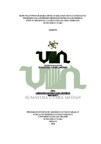 PRATAMA SITORUS, ARDIANSYAH (2024) Hubungan Postur Kerja Dengan Keluhan Musculoskeletal Disorders Dalam Proses Produksi Di Pks Pagar Merbau Ptpn Iv Regional 2 Lubuk Pakam, Deli Serdang Sumatera Utara. Skripsi thesis, UIN Surmatra Utara Medan.