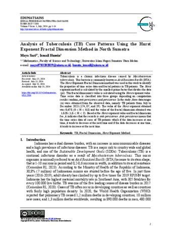 Sari, Maya (2024) Analysis of Tuberculosis (TB) Case Patterns Using the Hurst Exponent Fractal Dimension Method in North Sumatra. Edumatsains Jurnal Pendidikan Matematika dan Sains, 9 (1).