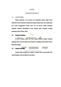 Latar Belakang: Boraks merupakan penghilang bau dan antiseptik yang ampuh. Sebagai antibakteri, pembersih kayu, dan antimikroba, zat ini sering digunakan dalam kosmetik. Boraks pada dasarnya bersifat karsinogenik. Lebih tepatnya, boraks dapat mengakibatkan gangguan pada bayi, gangguan pada ginjal, hati, dan testis, serta gangguan pada seluruh proses reproduksi. Tanjung Anom dan Glugur Rimbun adalah Dua Desa yang berada di Kecamatan Pancur Batu, Kecamatan Deli Serdang. Desa Tanjung Anom memiliki enam dusun, sedangkan Desa Glugur Rimbun hanya memiliki empat dusun. Tujuan: Untuk mengetahui kandungan boraks pada bakso yang dijual di warung bakso di Desa Tanjung Anom dan Desa Glugur Rimbun Kecamatan Pancur Batu Deli Serdang. Metode: Dalam penelitian cross-sectional ini, keberadaan boraks dalam bakso ditentukan secara kuantitatif experimental dengan mengevaluasi satu sampel pada satu waktu menggunakan metode Easy Test Kit Boraks. Hasil Penelitian: Berdasarkan uji Laboratorium pada bakso yang di ambil di warung Desa Tanjung Anom Kecamatan Pancur Batu Deli Serdang sebanyak 15 sampel memperoleh hasil Negatif dan di Desa Glugur Rimbun Kecamatan Pancur Batu Deli Serdang sebanyak 10 sampel memperoleh hasil negatif yang berarti tidak teridentifikasi adanya kandungan senyawa bahan kimia boraks. Saran: 1. Bagi pedagang bakso diharapkan standar mutu bakso dapat ditegakkan, sehingga penggunaan bahan kimia tambahan tidak akan berdampak buruk pada kesehatan orang yang memakannya. 2. Untuk penelitian lebih lanjut diharapkan juga dilakukan analisis kandungan boraks pada makanan lain seperti tahu, mi basah, kerupuk, dan lontong.