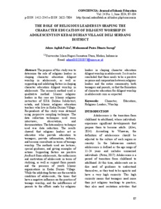 The purpose of this study was to determine the role of religious leaders in shaping character education diligent worship in adolescents, as well as supporting and inhibiting factors in shaping character education diligent worship in adolescents. The research method used is qualitative method. Islamic religious leaders in this case are Islamic religious instructors of KUA Delitua Subdistrict, ustadz, and Islamic religious education teachers who live in Kedai Durian Village. Respondents of this study were obtained using purposive sampling technique. The data collection techniques used were interviews, observation, and documentation. The data analysis technique used was data reduction. The results showed that religious leaders act as educators who provide education to teenagers, provide information, defence, and become consultants in terms of teenage worship. The methods used are lectures, special guidance, and giving examples of actions. Supporting factors are positive feedback from adolescents, the enthusiasm and motivation of adolescents in terms of studying, as well as support from parents and the presence of youth Islamic organisations in Kedai Durian Village. While the inhibiting factors are the unstable condition of adolescents, the times that have a negative influence on the practice of teenage worship, and the indifference of parents to the efforts made by religious leaders in shaping character education diligent worship in adolescents. So it can be concluded that there needs to be a positive response and cooperation between religious leaders and the entire community, both teenagers and parents, so that the formation of character education for diligent worship in adolescents runs as expected.