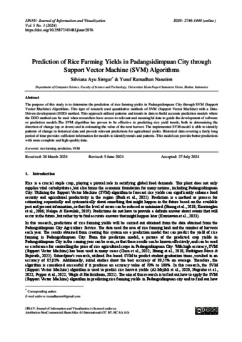 The purpose of this study is to determine the prediction of rice farming yields in Padangsidimpuan City through SVM (Support Vector Machine) Algorithms. This type of research used quantitative methods of SVM (Support Vector Machine) with a DataDriven development (DDD) method. This approach utilized patterns and trends in data to build accurate prediction models where the DDD method can be used when researchers have access to relevant and meaningful data to guide the development of software or prediction models.The SVM algorithm has proven to be effective in predicting rice yield trends, both in determining the direction of change (up or down) and in estimating the value of the next harvest. The implemented SVM model is able to identify patterns of change in historical data and provide relevant predictions for agricultural yields. Historical data covering a fairly long period of time provides sufficient information for models to identify trends and patterns. This model can provide better predictions with more complete and high-quality data.