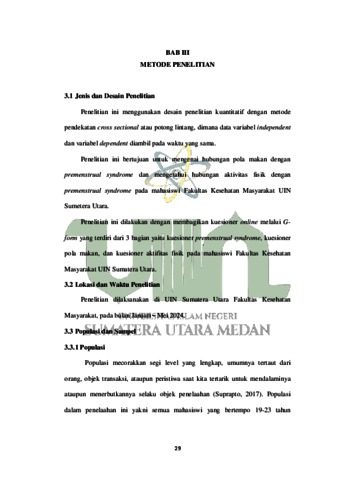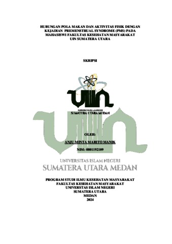 Manik, Anju Minta Marito (2024) Hubungan Pola Makan dan Aktivitas Fisik dengan Kejadian Premenstrual Syndrome (PMS) pada Mahasiswi Fakultas Kesehatan Masyarakat UIN Sumatera Utara. Diploma thesis, UIN Sumatera Utara.
