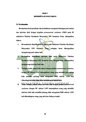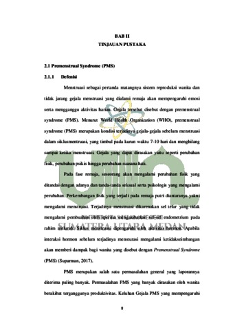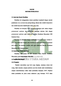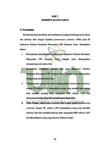 Premenstrual syndrome (PMS) PMS merupakan suatu kondisi haid yang berupa beberapa tanda terganggunya kondisi badan dan kejiwaan. Waktu kemunculan tanda PMS tercantum dimulai sejak satu minggu sampai segenap hari sebelum haid terjadi dan akan hilang ketika haid terjadi. Sekalipun demikian, ada juga yang masih berlangsung sampai masa haid selesai. Di Indonesia sendiri gejala PMS menyebabkan terganggunya aktivitas dan konsentrasi belajar pada 80%-90% wanita PMS. Penelitian ini bertujuan guna mengetahui hubungan pola makan dan aktivitas fisik dengan kejadian PMS pada mahasiswi Fakultas Kesehatan Masyarakat UIN Sumatera Utara. Penelitian ini menggunakan desain penelitian kuantitatif dengan metode pendekatan cross sectional. Sampel penelitian ini berjumlah 89 yang berasal dari mahasiswi S1 Fakultas Kesehatan Masyarakat UIN Sumatera Utara. Variabel yang diteliti terdiri dari gejala PMS, pola makan, dan aktivitas fisik. Hasil analisis menggunakan uji Chi-Square diketahui terdapat hubungan yang signifikan antara pola makan dan PMS dengan p-value 0,000 dan tidak terdapat hubungan antara aktivitas fisik dan PMS dengan p-value 0,919. Kesimpulan dalam penelitan ini semakin baik pola makan maka semakin ringan gejala PMS, walau demikian aktivitas fisik yang rutin juga diperlukan untuk memperoleh tubuh yang sehat.