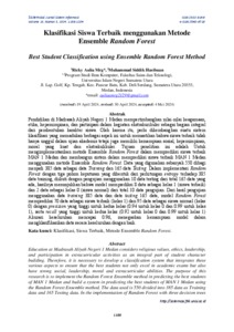 Pendidikan di Madrasah Aliyah Negeri 1 Medan mempertimbangkan nilai-nilai keagamaan, etika, kepemimpinan, dan partisipasi dalam kegiatan ekstrakurikuler sebagai bagian integral dari pembentukan karakter siswa. Oleh karena itu, perlu dikembangkan suatu sistem klasifikasi yang memadukan berbagai aspek ini untuk memastikan bahwa siswa terbaik tidak hanya unggul dalam ujian akademis tetapi juga memiliki kemampuan sosial, kepemimpinan, moral yang kuat dan ekstrakulikuler. Tujuan penelitian ini adalah Untuk mengimplementasikan metode Ensemble Random Forest dalam memprediksi siswa terbaik MAN 1 Medan dan membangun sistem dalam memprediksi siswa terbaik MAN 1 Medan menggunakan metode Ensemble Random Forest. Data yang digunakan sebanyak 550 dibagi menjadi 385 data sebagai data Training dan 165 data Testing. Dalam implementasi Random Forest dengan tiga pohon keputusan yang dibentuk dari perhitungan entropy terhadap 385 data training, diikuti dengan pengujian menggunakan 10 data testing dari total 165 data yang ada, hasilnya menunjukkan bahwa model memprediksi 8 data sebagai kelas 1 (siswa terbaik) dan 2 data sebagai kelas 0 (siswa normal) dari total 10 data pengujian. Dari hasil pengujian menggunakan data training 385 data dan data testing 165 data, model Random Forest memprediksi 70 data sebagai siswa terbaik (kelas 1) dan 95 data sebagai siswa normal (kelas 0) dengan precision yang tinggi untuk kedua kelas (0.94 untuk kelas 0 dan 0.99 untuk kelas 1), serta recall yang tinggi untuk kedua kelas (0.92 untuk kelas 0 dan 0.99 untuk kelas 1) Akurasi keseluruhan mencapai 0.96, menegaskan kemampuan model dalam mengklasifikasikan data secara keseluruhan dengan baik.