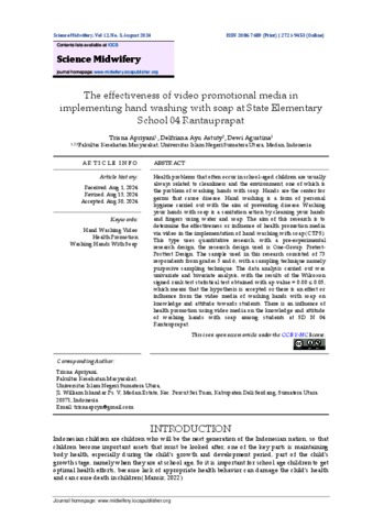 Apriyani, Trisna (2024) The effectiveness of video promotional media in implementing hand washing with soap at State Elementary School 04 Rantauprapat. Science Midwifery.