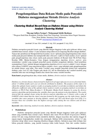 Diabetes merupakan penyakit kronis yang ditandai dengan tingginya kadar gula (glukosa) dalam yang melebihi batas normal, sekitar 1,5 juta kematian setiap tahun secara langsung dikaitkan dengan diabetes. Tujuan dari penelitian ini Memperoleh hasil analisis cluster optimal pada pengelompokkan data rekam medis pada penyakit diabetes dan memperoleh nilai silhouette coefficient hasil analisis cluster optimal pada pengelompokkan data rekam medis pada penyakit diabetes di Rumah Sakit TK-II Putri Hijau Kesdam I/BB, Medan-Sumatera Utara dengan menggunakan algoritma divisive analysis serta menentukan variabel yang menjadi penyebab pasien tersebut mengalami diabetes. Hasil penelitian menunjukkan Cluster optimal dengan menggunakan algoritma divisive analysis adalah 2 cluster dengan nilai sebesar 0,468582 yang menyatakan bahwa struktur cluster yang terbentuk pada pengelompokkan ini adalah klaster yang tepat. Dan untuk Variabel yang menjadi penyebab pasien bisa mengalami diabetes yaitu Usia (X2) dan Tingkat gula darah (X8). hal itu dikarenakan dua variabel tersebut yang memiliki nilai rata-rata tertinggi diantara dua cluster dan semua variabel tersebut.