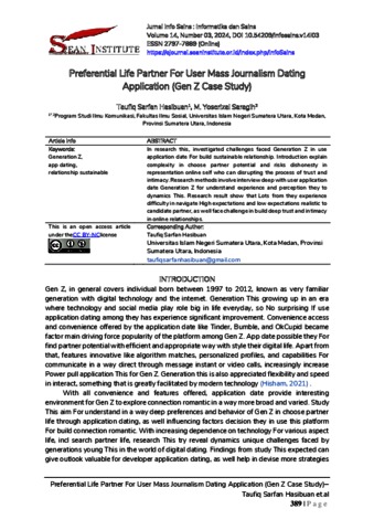Hasibuan, Taufiq Sarfan (2024) Preferential Life Partner For User Mass Journalism Dating Application (Gen Z Case Study). Jurnal Info Sains : Informatika dan Sains.