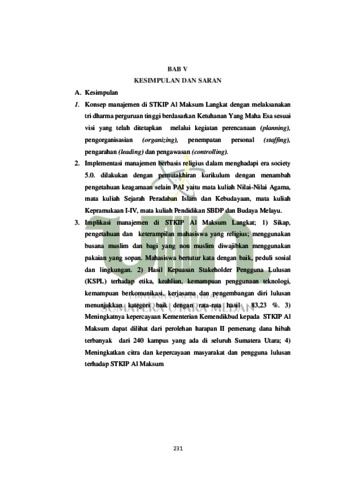 Penelitian ini untuk mendeskripsikan Konsep, Implementasi dan Implikasi Manajemen Kelembagaan Pendidikan Tinggi Berbasis Religius dalam Menghadapi Era Society 5.0 di STKIP Al Maksum Langkat. Penelitian ini menggunakan metode kualitatif deskriptif. Pengumpulan data diperoleh dengan cara observasi, wawancara dan telaah dokumen. Peneliti melakukan analisis data dengan mengumpulkan, kondensasi, penyajian dan menyimpulkan data. Hasil Penelitian: 1) Konsep manajemen kelembagaan di STKIP Al Maksum Langkat dengan melaksanakan tri dharma perguruan tinggi berdasarkan Ketuhanan Yang Maha Esa sesuai visi yang telah ditetapkan melalui kegiatan perencanaan (planning), pengorganisasian (organizing), penempatan personal (staffing), pengarahan (leading) dan pengawasan (controlling). 2) Implementasi manajemen berbasis religius di era society 5.0 dilakukan dengan pengembangan kurikulum dengan menambah pengetahuan keagamaan selain PAI yaitu mata kuliah Nilai-Nilai Agama dan Sejarah Peradaban Islam dan Kebudayaan, mata kuliah Kepramukaan I-IV, mata kuliah Pendidikan SBDP dan Budaya Melayu. 3). Dampak manajemen yang dilakukan: a) Sikap, pengetahuan dan keterampilan mahasiswa yang religius; menggunakan busana muslim dan bagi yang non muslim diwajibkan menggunakan pakaian yang sopan, bertutur kata dengan baik, peduli sosial dan lingkungan. b) Hasil Kepuasan Stakeholder Pengguna Lulusan (KSPL) terhadap etika, keahlian, kemampuan penggunaan teknologi, kemampuan berkomunikasi, kerjasama dan pengembangan diri lulusan menunjukkan kategori baik dengan rata-rata hasil 83,23 %. c) Meningkatnya kepercayaan Kementerian Kemendikbud kepada STKIP Al Maksum dapat dilihat dari perolehan harapan II pemenang dana hibah terbanyak dari 240 kampus yang ada di seluruh Sumatera Utara; d) Meningkatkan citra dan kepercayaan masyarakat dan pengguna lulusan terhadap STKIP Al Maksum.