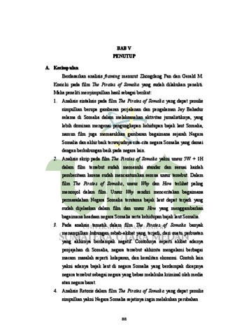 Penelitian ini berjudul “ Analisis Framing pada Film The Pirates Of Somalia, tujuan penelitian ini adalah untuk mengetahui analisis framing dalam Film The Pirates Of Somalia. Teori yang digunakan dalam penelitian ini adalah Teori Agenda Setting Media. Objek dalam penelitian imi adalah film The Pirates Of Somalia dengan cara pembingkaian Film, Metode yang digunakan dalam penelitian adalah kualitatif menggunakan pendekatan Logika Induktif. Teknik Analisis datanya menggunakan Analisis Framing Model Zhongdang Pan dan M. Kosicki. Hasil penelitian tersebut adalah bahwa negera Somalia yang dianggap berbahaya tidaklah nyata yang seperti dibayangkan pada negera barat tapi dalam adegan tersebut para aktivitas Jurnalisme sangatlah aman dan bebas.