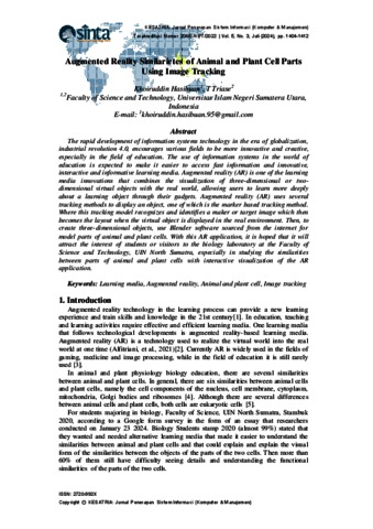 The rapid development of information systems technology in the era of globalization, industrial revolution 4.0, encourages various fields to be more innovative and creative, especially in the field of education. The use of information systems in the world of education is expected to make it easier to access fast information and innovative, interactive and informative learning media. Augmented reality (AR) is one of the learning media innovations that combines the visualization of three-dimensional or twodimensional virtual objects with the real world, allowing users to learn more deeply about a learning object through their gadgets. Augmented reality (AR) uses several tracking methods to display an object, one of which is the marker based tracking method. Where this tracking model recognizes and identifies a maker or target image which then becomes the layout when the virtual object is displayed in the real environment. Then, to create three-dimensional objects, use Blender software sourced from the internet for model parts of animal and plant cells. With this AR application, it is hoped that it will attract the interest of students or visitors to the biology laboratory at the Faculty of Science and Technology, UIN North Sumatra, especially in studying the similarities between parts of animal and plant cells with interactive visualization of the AR application.