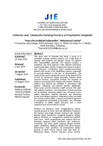 Ria Habibah Dalimunthe, Hazra Patience and Tawakal in Nursing Practice at Psychiatric Hospitals. JOURNAL OF ISLAMIC EDUCATION.