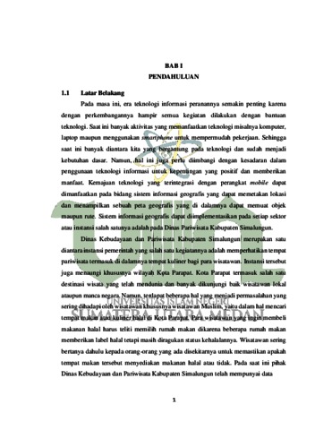 Dinas Kebudayaan dan Pariwisata Kabupaten Simalungun adalah salah satu instansi pemerintah yang kegiatannya adalah memperhatikan tempat pariwisata termasuk di dalamnya tempat kuliner bagi para wisatawan. Namun, terdapat beberapa hal yang menjadi permasalahan yang sering dihadapi oleh wisatawan khususnya wisatawan Muslim, yaitu dalam hal mencari tempat makan atau kuliner halal di Kota Parapat. Para wisatawan yang ingin membeli makanan halal harus teliti memilih rumah makan dikarena beberapa rumah makan memberikan label halal tetapi masih diragukan status kehalalannya. Algoritma haversine formula merupakan salah satu algoritma dalam sistem informasi geografis yang mampu memperhitungkan jarak terdekat dari lokasi awal ke lokasi tujuan. Dengan mengimplementasikan algoritma haversine formula pada sistem informasi geografis maka dapat digunakan untuk melakukan proses pencarian lokasi makanan halal terdekat yang ada di Kota Parapat dari lokasi pengguna. Penelitian ini bertujuan untuk bisa membantu masyarakat dalam mencari lokasi makanan halal terdekat di Kota Parapat dan diharapkan juga dapat dimanfaatkan oleh Dinas Kebudayaan dan Pariwisata Kabupaten Simalungun agar dapat menyajikan data lokasi makanan halal yang terintegrasi sistem informasi geografis yang berbasis mobile.