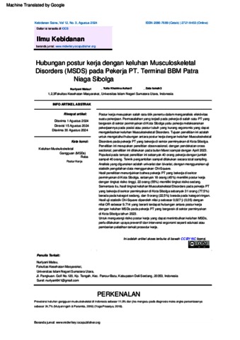 Malau, Nurlyani (2024) Hubungan postur kerja dengan keluhan Musculoskeletal Disorders (MSDS) pada Pekerja PT. Terminal BBM Patra Niaga Sibolga. The Science Midwifery.