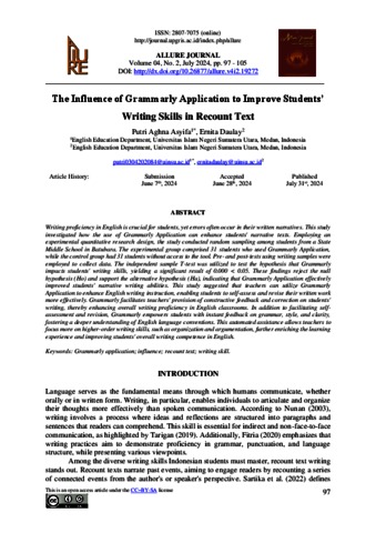 AGHNA ASYIFA, PUTRI The Influence of Grammarly Application to Improve Students’ Writing Skills in Recount Text. ALLURE JOURNAL.