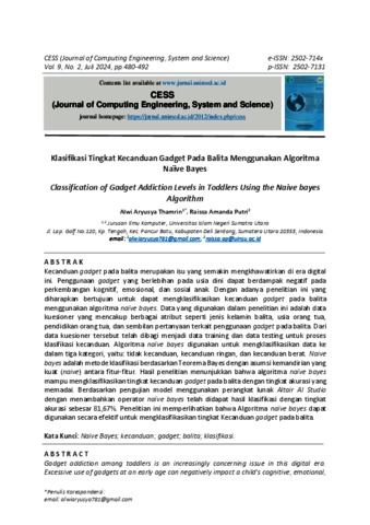 Thamrin, Alwi Aryusya (2024) Klasifikasi Tingkat Kecanduan Gadget Pada Balita Menggunakan Algoritma Naïve Bayes. CESS (Journal of Computing Engineering, System and Science).