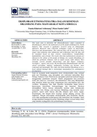 Aritonang, Tsania Khairani (2024) Eksplorasi Etnomatematika Dalam Kesenian Sikambang Pada Masyarakat Kota Sibolga. Jurnal Pembelajaran Matematika Inovatif.