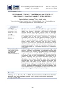Studi ini bertujuan untuk mengetahui unsur etnomatematika yang terdapat pada seni Sikambang, yang merupakan seni tradisional masyarakat Kota Sibolga, Sumatera Utara. Penelitian ini merupakan penelitian kualitatif dengan menggunakan pendekatan etnografi. Teknik pengumpulan data penelitian terdiri dari observasi, wawancara, dan dokumentasi. Data yang dikumpulkan akan dianalisis dalam tiga tahap: pengurangan data, penyampaian data, dan verifikasi. Selanjutnya, data akan diperiksa berdasarkan empat kriteria: kepercayaan, keteralihan, kebergantungan, dan kepastian. Hasilnya menunjukkan bahwa konsep matematika melekat pada kebudayaaan masyarakat kota Sibolga yaitu kesenian Sikambang yang memiliki unsur geometri, seperti sudut (lancip, siku-siku, tumpul), garis (lurus, sejajar, berpotongan), dan bangun datar (segitiga, persegi panjang, persegi, dan lingkaran). Dengan menerapkan etnomatematika pada kurikulum sekolah, siswa akan mendapatkan pembelajaran lebih kontekstual dan bermakna. Studi ini juga membantu menjaga kesenian Sikambang sebagai warisan budaya lokal yang semakin terpinggirkan oleh perkembangan kontemporer.