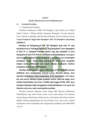 Penelitian yang telah dilakukan berjudul “Pengaruh Model Pembelajaran Word Square Terhadap Kemampuan Membaca Pemahaman Siswa MIS YPI Batangkuis” yang didasari oleh penguasaan siswa terhadap materi pembelajaran masih tergolong rendah sehingga mengakibatkan rendahnya kemampuan membaca pemahaman pada siswa. Tujuan dari penelitian ini adalah untuk mendeskripsikan pengaruh kemampuan membaca pemahaman pada kelas kontrol, pengaruh model pembelajaran word square terhadap kemampuan membaca pemahaman siswa pada kelas eksperimen dan perbedaan pengaruh yang signifikan di MIS YPI Batangkuis. Penelitian ini menggunakan pendekatan penelitian kuantitatif dan menggunakan metodologi eksperimen dengan desain kelompok kontrol pretestposttest yang melibatkan kelas kontrol dan eksperimen. Penelitian dilakukan pada populasi siswa kelas IV MIS YPI Batangkuis yang berjumlah 46 orang, yang dibagi menjadi dua kelompok secara merata, yaitu kelompok kontrol yang berjumlah 23 siswa dan kelompok eksperimen yang berjumlah 23 siswa. Pengumpulan data dilakukan dengan menggunakan instrumen tes sebagai teknik pengumpulan data primer. Berdasarkan hasil uji hipotesis uji t diperoleh nilai sebesar 1,680. Setelah membandingkan nilai dan , diketahui bahwa lebih besar dari (3,378 > 1,680) pada taraf signifikansi 5%. Hasilnya hipotesis alternatif ( ) diterima sedangkan hipotesis nol ( ) ditolak. Hal ini menunjukkan bahwa hipotesis yang diuji dalam penelitian ini dapat didukung, yang menyatakan bahwa terdapat pengaruh yang signifikan penggunaan model pembelajaran word square terhadap keterampilan membaca pemahaman siswa di MIS YPI Batangkuis.