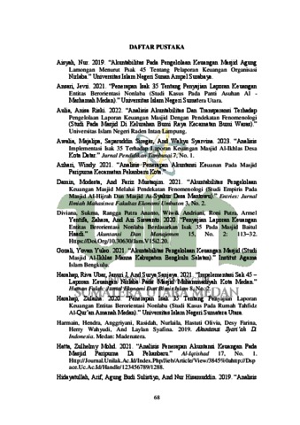 Penelitian ini bertujuan untuk mengetahui tentang bagaimana akuntabilitas pada pengelolaan keuangan yang ada di masjid Al-Husna dan untuk mengetahui bagaimana kesesuaiannya dengan ISAK 35 mengenai pelaporan keuangan organisasi nirlaba. Metode yang digunakan dalam penelitian ini adalah metode penelitian kualitatif deskriptif. Teknik pengumpulan data yang digunakan adalah observasi, wawancara, dan dokumentasi. Menurut ISAK 35, laporan keuangan entitas nonlaba meliputi laporan posisi keuangan, laporan penghasilan komprehensif, laporan arus kas dan catatan atas laporan keuangan. Dengan adanya pengelolaan kas yang baik, kita dapat menyediakan informasi kepada para donatur maupun pada pihak-pihak lain yang berkepentingan. Hasil penelitian ini menunjukkan bahwa pengelolaan keuangan pada Masjid Al-Husna masih belum sesuai dengan standar ISAK 35, dan pencatatan yang dilakukan pengurus masjid masih sederhana yaitu pencatatan pemasukkan dan pengeluaran yang disajikan setiap jumat secara manual.Proses pertanggungjawaban yang dalam hal ini adalah proses pengungkapan kepada para jamaah masih belum maksimal perinciannya, hanya menyampaikan jumlah pemasukan dan pengeluaran tanpa perincian yang jelas. Meskipun begitu para pihak masjid sudah berusaha untuk melakukan pengungkapan sebaik mungkin. Hal ini dikarenakan pihak pengurus masjid belum mengetahui sistem pencatatan keuangan berdasarkan ISAK 35.