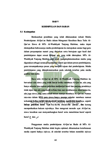 Penelitian ini berjudul “Media Pembelajaran Al-Qur`an Hadis Dalam Mengatasi Kesulitan Baca Tulis Al-Qur`an Siswa di MTs Al Washliyah Tanjung Haloban Labuhanbatu” yang dilatarbelakangi, bahwa saat ini banyak dijumpai siswa-siswi yang kesulitan dalam membaca Al-Qur`an karena kurangnya motivasi dalam diri siswa dan dukungan dari orangtua juga minimnya guru ngaji. Maka dengan pembelajaran Al-Qur`an Hadis yang ada di MTs, serta kreativitas guru dalam menggunakan media sebagai alat bantu dalam proses pembelajaran diharapkan dapat mengatasi kesulitan baca tulis Al-Qur`an yang dialami oleh para siswa. Penelitian ini menggunakan pendekatan kualitatif dengan jenis penelitian deskriptif dan teknik pengumpulan data yaitu observasi, wawancara serta dokumentasi, dalam analisis data ada tiga langkah yang dilakukan, yaitu reduksi data (mengumpulkan data), display data (penyajian data), serta menarik kesimpulan. Hasil penelitian mengungkapkan bahwa (1) keadaan baca tulis Al-Qur`an siswa bervariasi, banyak siswa hanya mampu membaca Al-Qur`an namun keliru dalam membedakan pelafalan makhorijul huruf juga tajwidnya, dan banyak siswa yang kesulitan menyambungkan ayat yang ditulis, (2) penggunaan media pembelajaran Al-Qur`an Hadis kurang optimal, karena keterbatasan media yang ada, (3) dan penyebab siswa kesulitan baca tulis Al-Qur`an, tidak ada motivasi dari dalam diri, dan kurangnya dukungan dari orangtua, juga keterbatasan guru ngaji, (4) Upaya penanggulangan yang dilakukan yaitu dengan membuat kursus Tahsin yang diadakan disetiap hari jum’at.