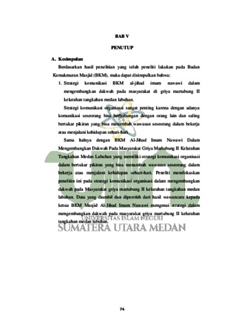 Penelitian ini bertujuan untuk mengetahui strategi komunikasi bkm masjid al-jihad imam nawawi dalam mengembangkan dakwah pada masyarakat di griya martubung II kelurahan tangkahan medan labuhan. Program kegiatan bkm al-jihad imam nawawi dalam mengembangkan dakwah pada masyarakat di griya martubung II kelurahan tangkahan medan labuhan. Serta hambatan bkm al-jihad imam nawawi dalam mengembangkan dakwah pada masyarakat di griya martubung II kelurahan tangkahan medan labuhan. Pendekatan penelitian ini menggunakan deskriptif kualitatif, karena penelitian ini menjelaskan fenomena yang terjadi dilapangan dengan cara mengumpulkan data-data yang diperoleh dari informan penelitian. Teknik pengumpulan data yang digunakan dalam penelitian ini yaitu dengan melakukan wawancara mendalam (depp interview), dan dokumentasi. Hasil penelitian yang ditemukan peneliti sebagai berikut, (1) Strategi bkm aljihad imam nawawi dalam mengembangkan dakwah pada masyarakat di griya martubung II kelurahan tangkahan medan labuhan adalah strategi persuasif. Strategi persuasif adalah cara membujuk dan mengajak mad‟u dalam mempelajari ajaran Islam. (2) Program kegiatan bkm al-jihad imam nawawi dalam mengembangkan dakwah pada masyarakat di griya martubung II kelurahan tangkahan medan labuhan adalah dengan melakukan kegitan-kegiatan Islami seperti pengajian, penyuluhan dan silaturrahmi. (3) Hambatan bkm al-jihad imam nawawi dalam mengembangkan dakwah pada masyarakat di griya martubung II kelurahan tangkahan medan labuhan adalah kurangnya biaya yang mengakibatkan terlambatnya pembangunan masjid dari rencana sebelumnya, dan kurangnya kesadaran masyarakat dalam mempelajari agama Islam.