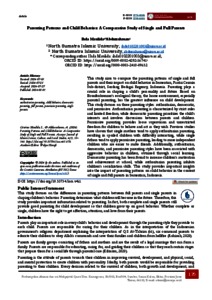 This study aims to compare the parenting patterns of single and full parents and their impact on child behavior in Sementara, Pantai Cermin Sub-district, Serdang Bedagai Regency, Indonesia. Parenting plays a crucial role in shaping a child's personality and future. Based on Bronfenbrenner's ecological theory, the home environment, especially parental parenting, has the greatest influence on child development. This study focuses on three parenting styles: authoritarian, democratic, and permissive. Authoritarian parenting is characterized by strict rules and limited freedom, while democratic parenting prioritizes the child's interests and involves discussions between parents and children. Permissive parenting provides loose supervision and unrestricted freedom for children to behave and act as they wish. Previous studies have shown that single mothers tend to apply authoritarian parenting, resulting in spoiled children with difficulty interacting, while single fathers tend to apply permissive parenting, leading to more independent children who are easier to make friends. Additionally, authoritarian, democratic, and permissive parenting styles have been associated with aggressive behavior in children, obtained through social learning. Democratic parenting has been found to increase children's motivation and achievement at school, while authoritarian parenting inhibits children's socialization skills. This study provides important insights into the impact of parenting patterns on child behavior in the context of single and full parents in Sementara, Indonesia.