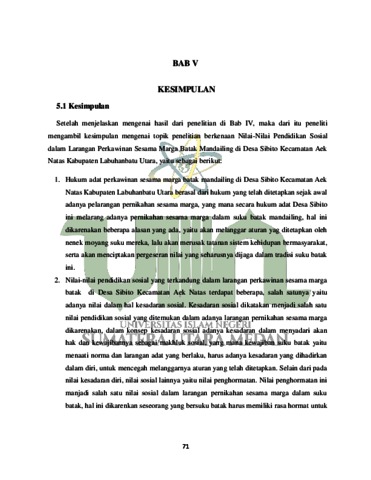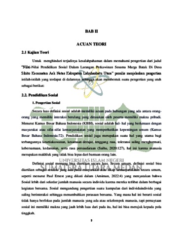 Skripsi ini menggambarkan mengenai Nilai-Nilai Pendidikan Sosial dalam larangan perkawinan dengan sesama marga batak mandailing. Penelitian ini dilakukan di Desa Sibito Kecamatan Aek Natas Kabupaten Labuhanbatu Utara. Penelitian ini menjabarkan mengenai nilai pendidikan sosial yang terdapat dalam larangan pernikahan sesama marga pada suku batak mandailing. Larangan yang ada telah lahir sejak masa nenek moyang atau awal dari lahirnya suku batak, yang mana larangan ini menunjukan bahwa adanya tali persaudaraan sesama marga, seperti halnya pada marga suku batak mandailing. Pada penelitian ini memiliki tujuan untuk mendeskripsikan nilai-nilai pendidikan sosial yang ditemukan dalam larangan pernikahan sesama marga karena seyogyanya diyakini bahwasanya pada sesama suku marga batak memiliki hubungan persaudaraan yang erat hingga dilarangnya untuk menikah. Hasil penelitian yang didapat menunjukkan bahwa terdapatnya nilai-nilai pendidikan sosial yang dijumpai dalam larangan pernikahan sesama marga batak mandailing, para tetua desa batak mandailing memberikan pandangan atau pengetahuannya terkait larangan menikah dengan sesama marga suku batak mandailing dengan diberikanya pengetahuan serta pemahaman membuat orang yang belum memahami kenapa sesama marga batak mandailing tidak boleh menikah jadi mengetahuai alasan dibaliknya. Selain itu juga, adanya larangan ini menunjukan bahwa terdapatnya nilai pendidikan sosial seperti dengan adanya larangan menikahi sesama marga, dapat menjaga kerukunan atau tali persaudaraan sesama suku batak mandailing
