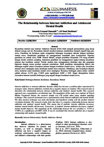 Damanik, Amanda Geopani (2024) The Relationship between Internet Addiction and Adolescent Mental Health. Jurnal Edumaspul: Jurnal Pendidikan.