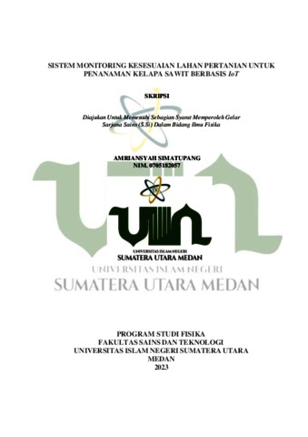 Simatupang, Amriansyah (2023) Sistem Monitoring Kesesuaian Lahan Pertanian Untuk Penanaman Kelapa Sawit Berbasis IoT. Diploma thesis, UIN Sumatera Utara.