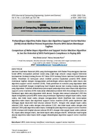 Lestari, Rika Dinda (2024) Perbandingan Algoritma Naïve Bayes dan Algoritma Support Vector Machine (SVM) Untuk Melihat Potensi Kepatuhan Peserta BPJS Dalam Membayar Tagihan. CESS (Journal of Computing Engineering, System and Science).