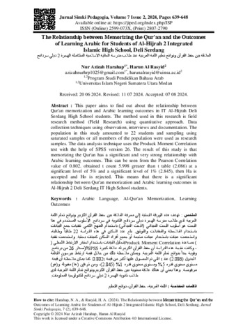 Harahap, Nur Azizah (2024) العالقة بين حفظ القرآن ونواتج تعليم اللغة العربية عند طالب مدرسة العالية االسالمية المتكاملة الهجرة 2 ديلي سردانج. Jurnal Simki Pedagogia, 7 (2).
