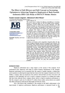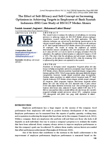 Amarani, Fauziah and Sugianto, Sugianto and Ilhamy, Muhammad Lathief (2024) The Effect of Self-Efficacy and Self-Concept on Increasing Optimism in Achieving Targets in Employees of Bank Syariah Indonesia (BSI) Case Study of BSI KCP Medan Aksara. Jurnal Manajemen Bisnis, 11 (2). pp. 985-998. ISSN e-ISSN: 2621-1971|p-ISSN: 2088-7086