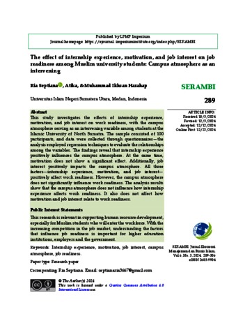 Septiana, Ria (2024) The effect of internship experience, motivation, and job interest on job readiness among Muslim university students: Campus atmosphere as an intervening. SERAMBI: Jurnal Ekonomi, 6 (3).
